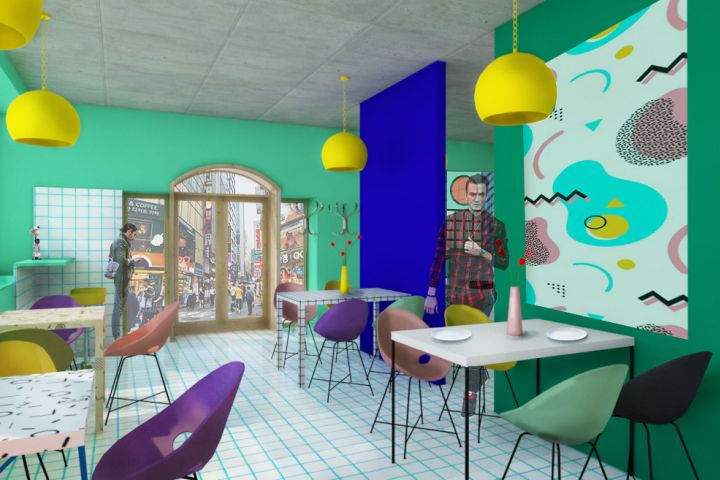 Разработка дизайн-концепции интерьера кафе, расположенного на двух этажах, в стиле Мемфис. Второй этаж также оснащён сценой и декоративным аквариумом за ним, где плавают живые рыбки, придавая интерьеру дополнительной свежести.