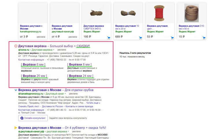 Cпецсимволы + КАПС в объявлении продажи верёвок / Yandex Direct