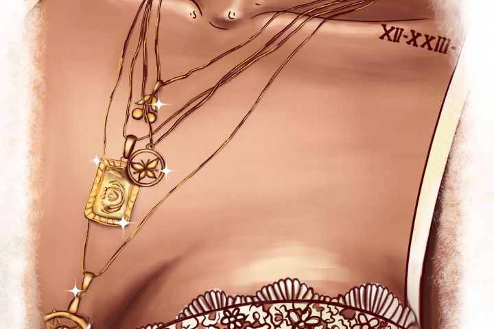 Арт девушки в красивом топе с золотыми украшениями
