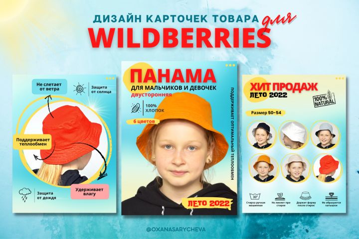 Показать панаму с разных сторон. Выделить преимущества, добавить яркость, показать цвета в наличии. Заказчик заказал простое оформление без излишеств.