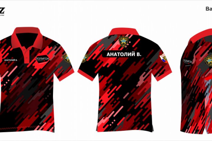 Задача: яркий дизайн с размещением трех разных логотипов, но в то же время практичный, не маркий (во время практики смазка и порох попадает на одежду, дизайн одежды должен был быть разработан так, что бы этих пятен почти не было видно на футболке)