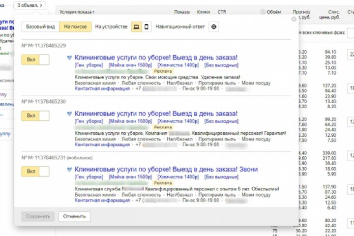 Создание объявлений для клининговых услуг. Индивидуальная авторская настройка. Повышение качества такой настройки происходит за счёт максимальной релевантности, объявлений отдельно для мобильных и десктопных устройств и сразу А/Б тестирований нескольких вариантов объявлений.
