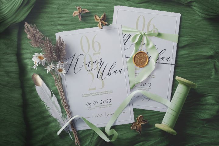 Двухстороннее свадебное приглашение на дизайнерской текстурной бумаге с лентой