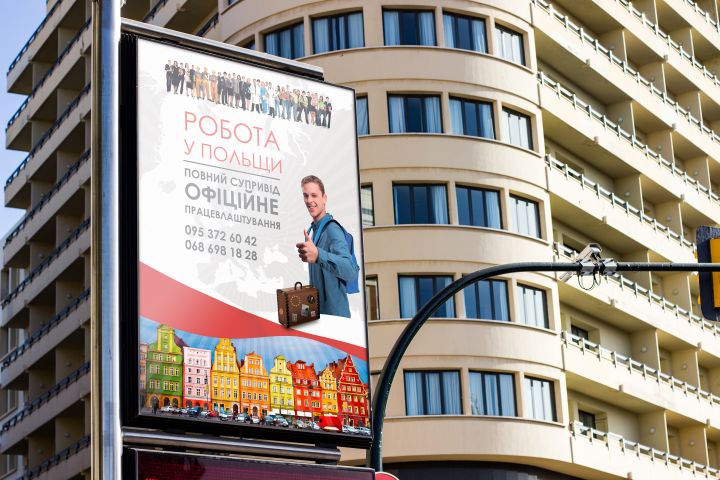 Яркая свежая реклама. Необходимо было указать сферы деятельности трудоустройства – для этой цели создан коллаж работников разных профессий. 2016