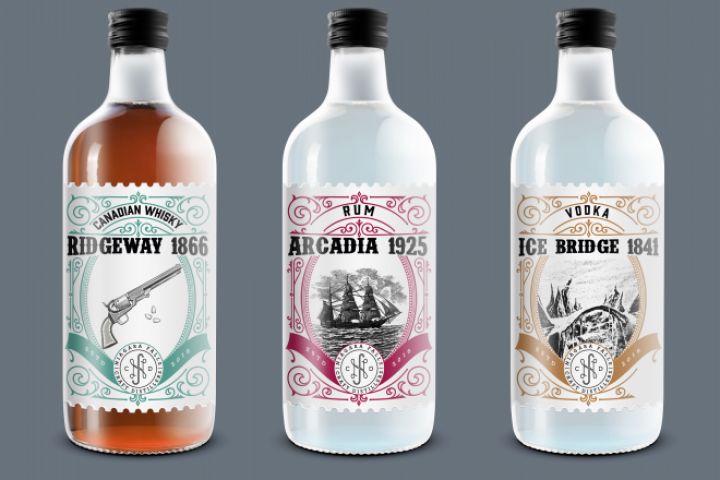 Разработка этикеток для канадского алкоголя - рома, виски, водки, связанных с историей Ниагарского водопада