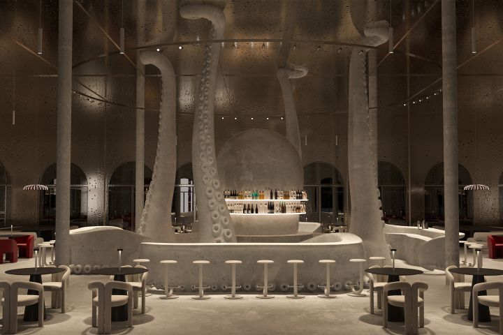 Дизайн-проект (и 3d визуализации) для ресторана Бориса Зарькова, основателя White Rabbit Family. Заказчик Борис Зарьков хотел, чтобы его новый ресторан воплощал в себе все атрибуты Дубая: роскошь, люкс, многонациональную публику, которую объединяет одно — желание получить незабываемые впечатления! Мы поставили задачу сделать запоминающийся, яркий проект, который бы выделялся мощной эстетикой и стал новой точкой притяжения среди ресторанов Дубая, так родился Octopus. Первый зал — представляет собой крытое помещение с основной кухней. Мы захотели сделать его камерным, немного мистическим, как океаническая пещера. Стены этого зала отделаны красным мрамором с ярко-выраженными прожилками, что с одной стороны добавляет пространству роскоши и люкса, а с другой — ассоциируется с кожей осьминога. Светильники и предметы мебели плавных форм напоминают водоросли, плавники, волны. Так же 1 зал включает в себя винную зону с собственным сомелье и посадкой для дегустации вин. Второе помещение ресторана воплощено в эстетике океанического царства, в котором царь морей великий Октопус четырьмя щупальцами держит потолок, а остальными 4-мя захватывает и привлекает за свой стол посетителей, чтобы накормить голодную публику первоклассными морскими деликатесами. Задача была не просто удивить заказчика ярким объектом, нам было важно сделать Октопуса функциональным: с одной стороны наш осьминог вмещает посадку на 36 человек, эксклюзивное обслуживание обеспечивают 4 бармена. С другой стороны барная зона является местом для приготовления японской кухни, имеет 4 суши стола. Octopus является частью стиля и концепции единого пространства, но главное создает настроение шоу — это сделано не случайно, так как состоятельная публика в Дубае идет в заведения в первую очередь за впечатлениями. Эта зона представляет собой крытую террасу с большими окнами, которые работают на открытие в прохладный период года. Третья зона — открытая терраса, это bech club, который является частью ТЗ от Бориса Зарькова. Мы решили поддержать морскую эстетику, добавив эле