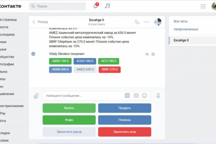 Пример чат-бота для ВК. Игра имитирует торговлю акциями на бирже.