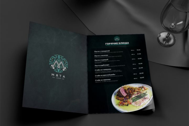 Меню, разработанное для заведения Мята Lounge (Новополоцк, РБ). По желанию заказчика добавлены реальные фото блюд на каждую страницу макета.