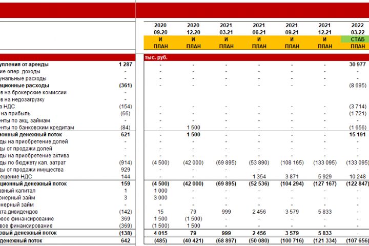 Финансовая модель, моделирующая строительную фазу проекта, включая возврат НДС и использование этих средств для минимизации долговой нагрузки проекта. Также модель включает модуль, моделирующий денежные потоки от арендных контрактов