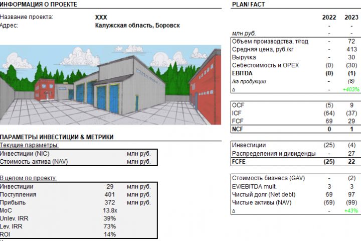 Разработана и внедрена финансовая модель инвестиционного проекта по выращиванию грибной продукции. Финансовая модель позволила автоматизировать работу финансового блока для молодой компании (автоматизация план/факта, управление прогнозами по ключевым предпосылкам бизнеса, работа с бюджетами строительства и сроками) в результате бухгалтер компании смог самостоятельно выполнять работу всего финансового отдела. Дополнительно, финансовая модель была использована для привлечения банковского финансирования.