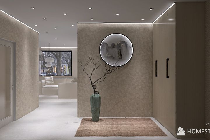 Лаконичная прихожая с напольным зеркалом во весь рост и мягкий пуф. Необычность интерьеру придает парящий потолок с подсветкой по всему периметру и отличное сочетание мебели из натуральным материалов.