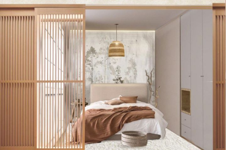 3Д спальни в скандинавском стиле в экологичном направлении. Предметы интерьера из ротанга, мебель из натурального массива дерева. Легкий , теплый и уютный интерьер