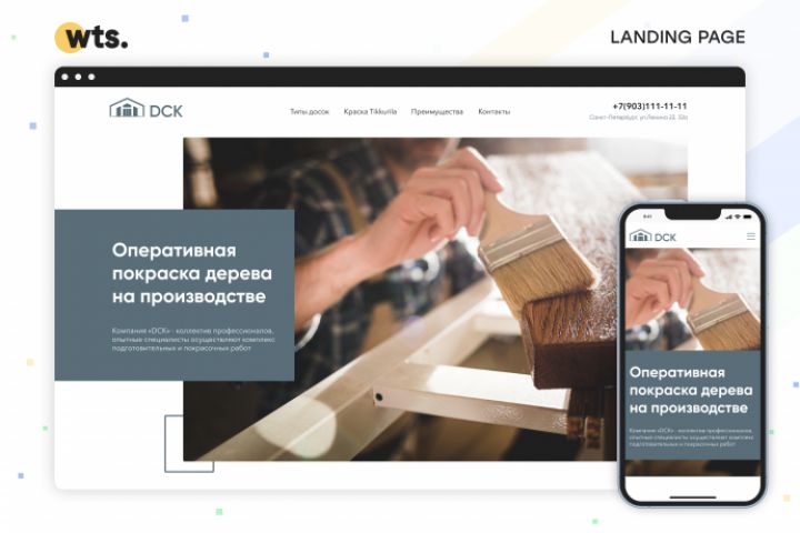 Разработка лендинга для продажи услуг по покраске дерева и досок на производстве. Необходимо было сделать стильный, но простой дизайн с указанием типов досок, которые окрашивают, сделать прайс для каждого типа досок, рассказать о преимуществах краски.