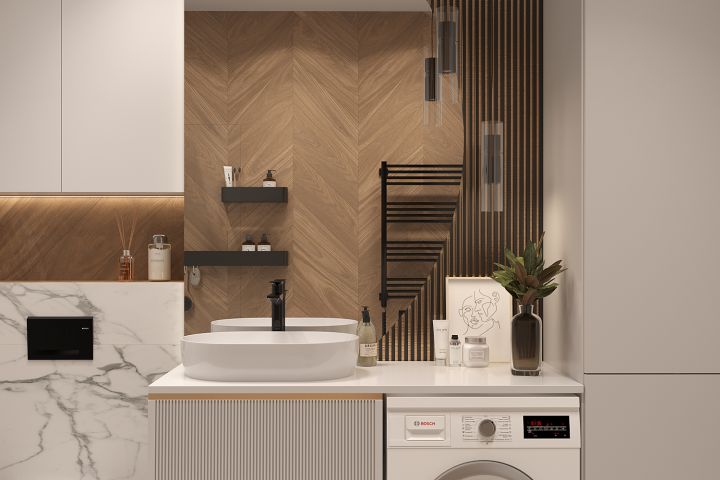 Совмещенный санузел в современном стиле. Площадь помещения 6 м2