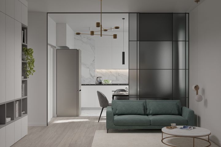 Совмещенная кухня-гостиная в современном стиле, разделенная перегородкой на зону приёма пищи и зону отдыха. Площадь помещения 24,5 м2