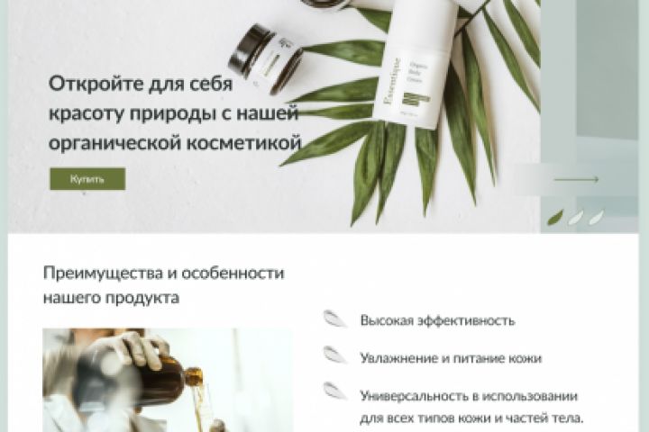 Задача разработать одностраничный cайт. Компания занимается продажей косметических средств высокого качества для женщин. Особенности и преимущества продукта включают в себя: