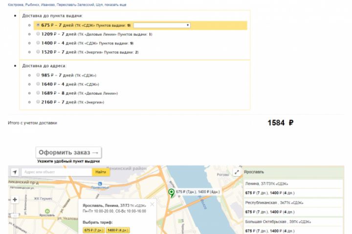 Рассчет доставки от нескольких ТК в корзине интернет-магазина + картак пунктов выдачи с тарифами.