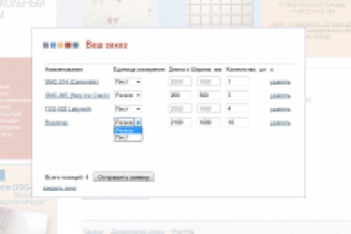 интерактивная корзина во всплывающем окне с возможностью выбрать размеры для нарезки стекла