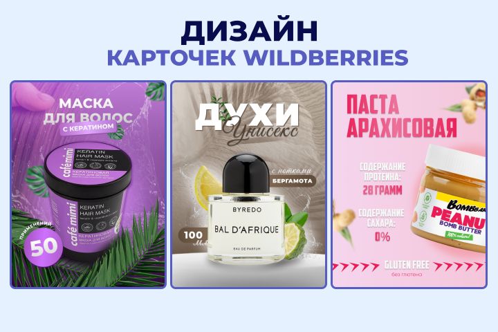 Карточка товара маска для волос создана в ярких, сочных цветах с целью показать клиенту, как маска может увлажнить волосы.