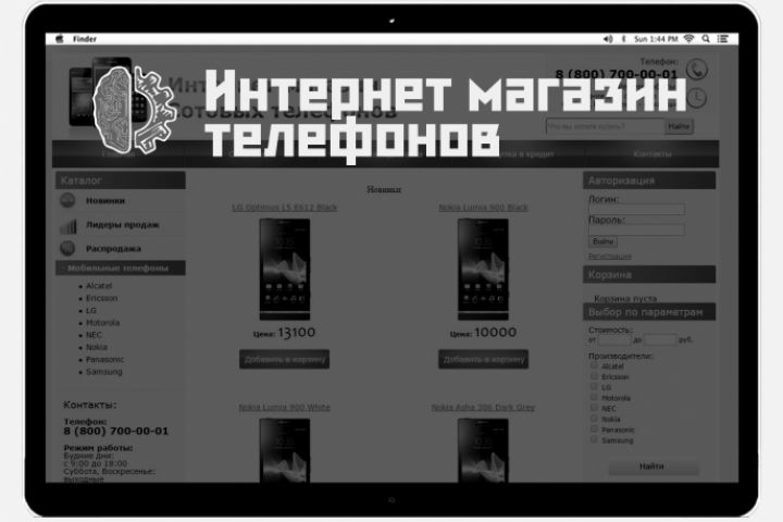 Интернет-магазин сотовых телефонов. Создан с нуля (самописный) по стандартному шаблону MVC, при помощи языков html, css, php, sql, javascript. Имеется каталог товаров, галерея просмотра изображений товара, страницы, регистрация, корзина, подбор по параметрам, поиск и, конечно же, удобная панель управления. Сайт тестовый и поэтому домен некрасивый и текста нет.
