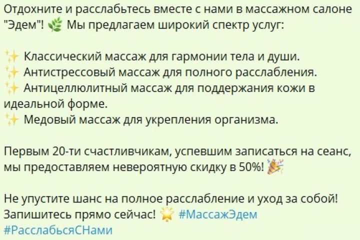 Нужен рекламный текст для массажного салона "Эдем", услуги салона: массаж одной зоны, классический массаж, антистрессовый массаж, антицеллюлитный массаж, медовый массаж. Первым 20 людям, успевшим записаться на сеанс, предоставляем скидку в 50%!