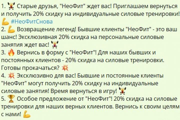 Нужны 5 рекламных текстов, для смс рассылки Фитнес-центра "НеоФит".