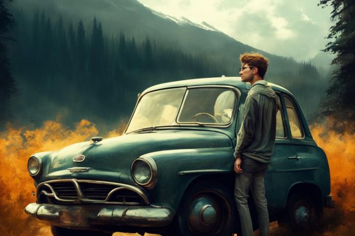 изображение парень машина природа.Сделано при помощи нейросети Fusion Brain.