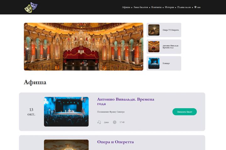 верстка сайта (https://sirmaxf.github.io/theatre/) и эта же верстка на сайте с применением php и обращением к базам данных (http://o9290256.beget.tech/). В последнем случае реализован функционал регистрации/входа пользователя, возможность оставлять комментарии, собственноручно написана админ-панель.