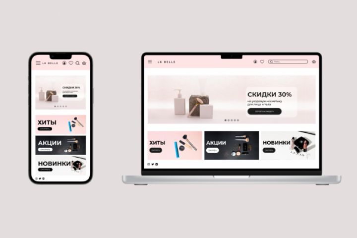 Оформлен первый экран интернет-магазина косметики, также разработан логотип. Адаптация сайта под различные устройства