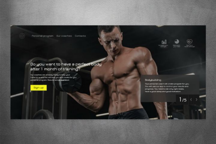 Разработка дизайна для сети спортзалов, акцент на индивидуальную программу бодибилдинга с персональным тренером.
