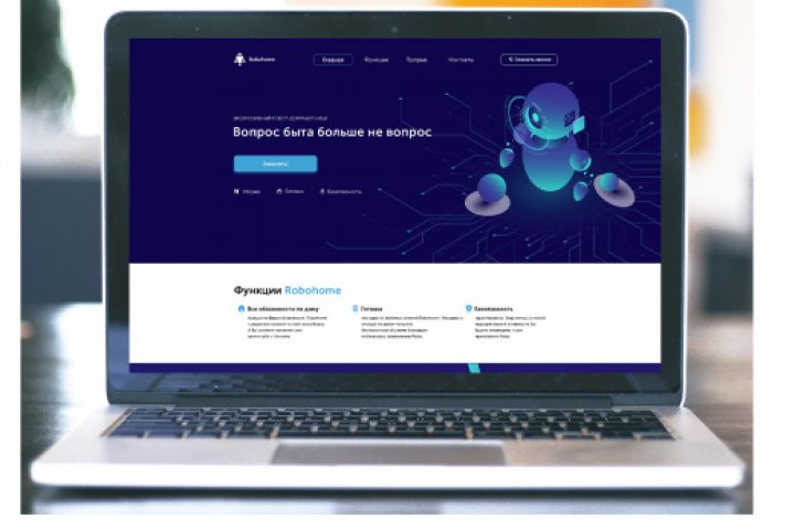 Дизайн Landing Page для продукта искусственного интеллекта. Проект создан в Adobe Photoshop. Белый и синий цвета фигурируют как подходящие для сферы технических инноваций. Ярко-голубая CTA контрастирует на темном фоне и призывает к быстрому заказу продукта.