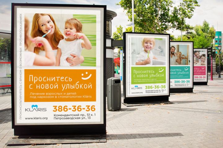 Разработка дизайна наружной рекламы и полиграфии для стоматологии Klaris