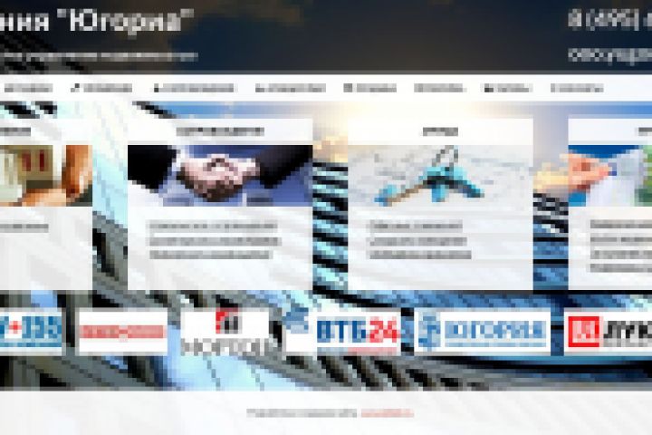 Сайт-визитка для компании по управлению недвижимостью "Югориа". Слайдер фоновых изображений, слайдер партнерских баннеров, выпадающее меню, информационный каталог недвижимости, информационные страницы.