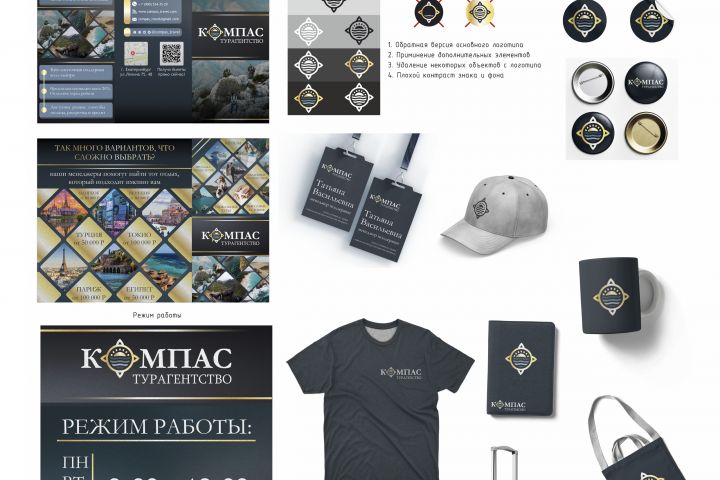 Необходимо было разработать фирменный стиль для турагентства "Компас" в него входит: логотип, буклет, табличка рабочего режима, флаер, правила использования логотипа, календарь, сувенирная продукция, визитка, вывеска.