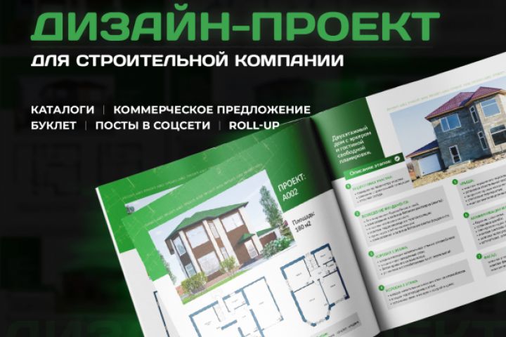 Дизайн для строительной компании "Группа А". В проекте представлены каталоги, коммерческое предложение, буклет, посты в соцсети, roll-up.