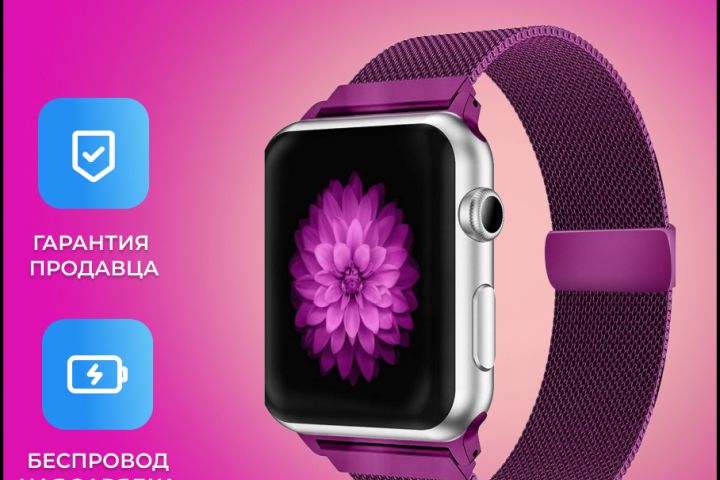 Небольшая информативная карточка умных часов для WB, с приятной цветовой гаммой.