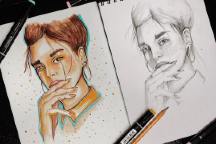 иллюстрация выполнена маркерами, справа эскиз в карандаше