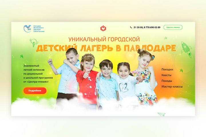 Разработан дизайн Landing Page для детского лагеря в Павлодаре, в котором отдых совмещен с учебой по методикам Лысенко. Задача – яркий привлекательный дизайн в теплой летней гамме.