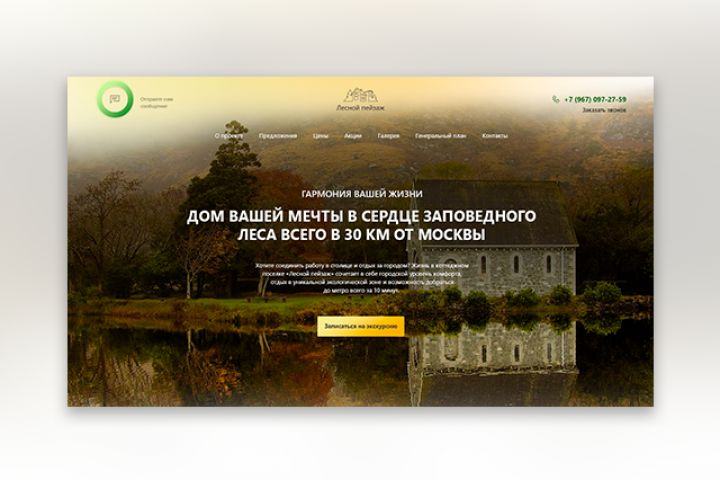 Разработка сайта в формате Landing Page для коттеджного поселка «Лесной пейзаж» недалеко от Москвы, предлагающий к продаже дома, а также участки без подряда – лесные, прилесные и стандартные. Сайт, по сути, продает мечту современных москвичей среднего возраста – жить в своем доме в живописном месте на природе, в комфортных условиях и близко к столице.