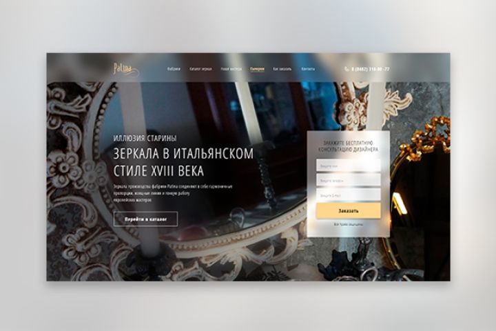 Разработка Landing Page для компании «Patina», занимающейся продажей итальянских зеркал. Сайт отражает специфику заказчика – зеркала, состаренные под стилистику XVIII века, сочетание искусства и современных тенденций в интерьере.