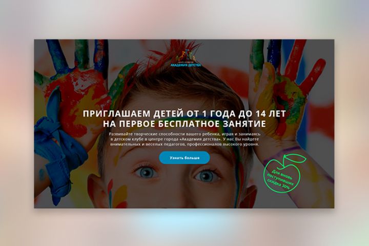 Разработка Landing Page для центра развития детского творчества «Академия детства». Детская тематика в современной стилистической обработке.