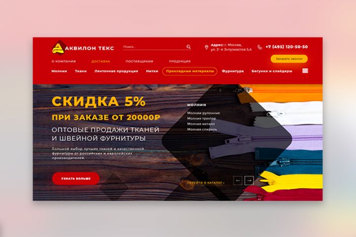 Корпоративный сайт для компании, занимающейся оптовыми поставками тканей и швейной фурнитуры «Аквилон-текс». Пожелания заказчика – белый фон, использование оранжевого и бордового цветов. Задача – разместить большой объем информации с множеством категорий товара, сохраняя при этом ощущение легкости и лаконичности.