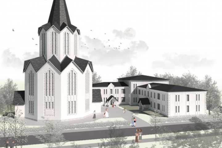 Проект храмового комплекса в Петербурге, посвященный святой Нино, покровительнице блокадного Ленинграда. Храм спроектирован вместе с домом причта, предусматривает выставочное пространство и небольшой сквер для прогулок. Сам храм выполнен в виде свечи, как вечная память героям Ленинграда. Стиль лаконичный, аскетичный, с/б расцветка. Использован характерный крест св. Нино.