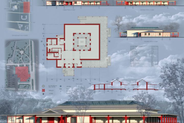 Дизайн-проект выставочного павильона восточных искусств. Спроектирован рядом с буддийским храмом в Санкт-Петербурге. Стиль восточный, деревянный. Павильон представляет из себя замкнутую квадратную галерею, окружающую внутренний зеленый двор с деревом и садом камней. Окружен террасой со скамьями и выходом в сквер.