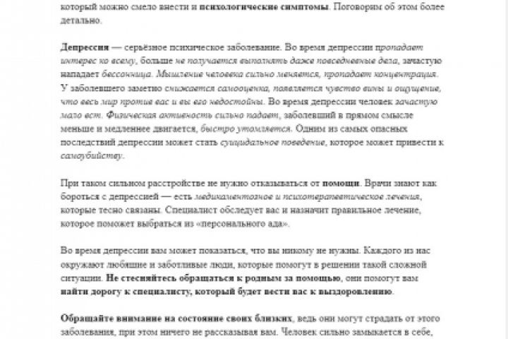 Будьте внимательны к себе и окружающим. Депрессия очень тяжелое психическое заболевание, но врачи умеют с ним бороться. Не затягивайте поход к врачу, ведь это может стоить жизни вам или вашим близким!
