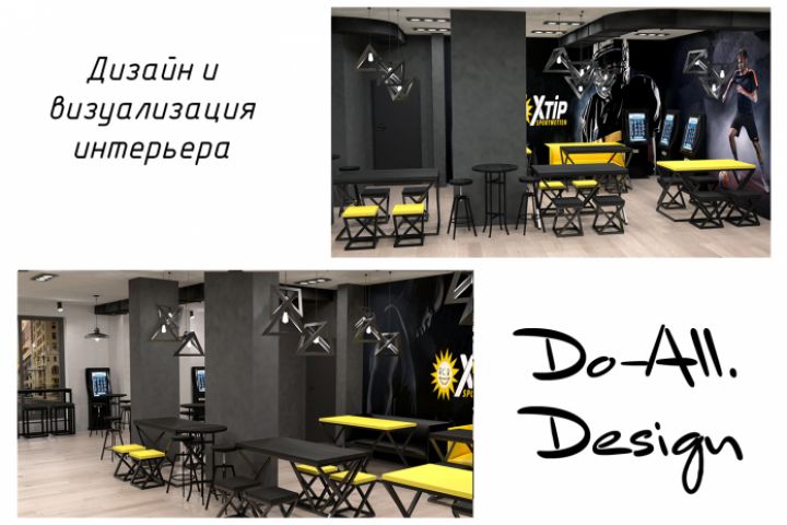 Разработка дизайна и визуализация интерьера спорт бара в Германии. Расположение необходимого оборудования для компании, занимающейся ставками на спорт.
