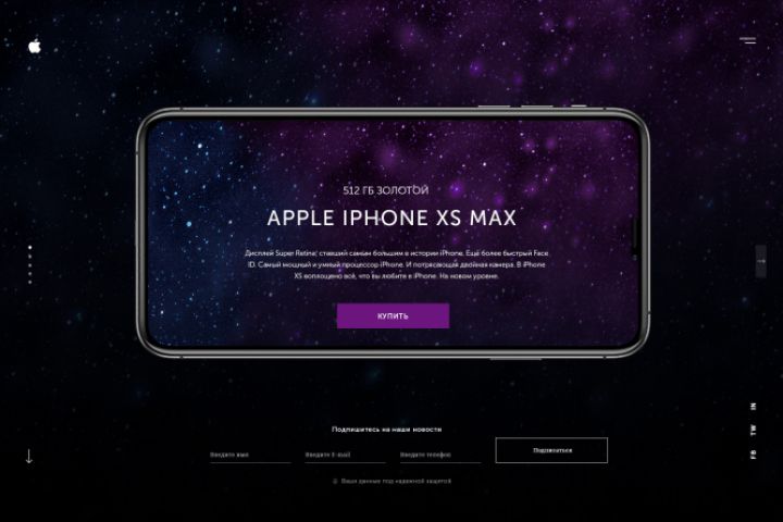 Разработка первого экрана сайта в формате Landing Page для продвижения одного из гаджетов компании Apple. Сайт был спроектирован в темных тонах, с использованием эффекта звездного неба, чтобы подчеркнуть эксклюзивность как самой компании, так и конкретного гаджета.