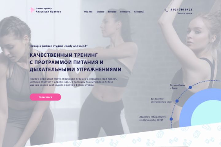 Этот сайт был разработан для молодой и энергичной девушки фитнес-тренера, которая организует спортивные занятия для девушек и женщин. Поэтому в дизайне мною были использованы нежные цветовые оттенки с использованием ярких акцентов и градиентов, применены различные ассиметричные элементы, чтобы дизайн сайта говорил о спорте. активности и легкости.