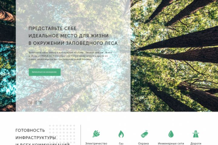 Разработка сайта в формате Landing Page для компании, занимающейся реализацией земельных участков и домов в коттеджном поселке "Лесной пейзаж" . По желанию клиента, сайт был спроектирован в светлых тонах, с акцентом на экологичность, а также расположение поселка в непосредственной близости от лесного массива.