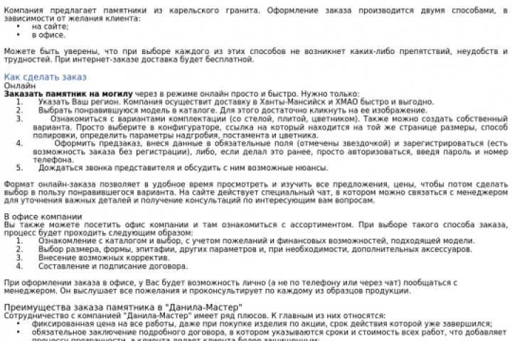 Текст для сайта ханты-мансийского подразделения компании «Данила-Мастер». Ключевые слова: заказать памятник на могилу, заказать памятник на могилу в Ханты-Мансийске.